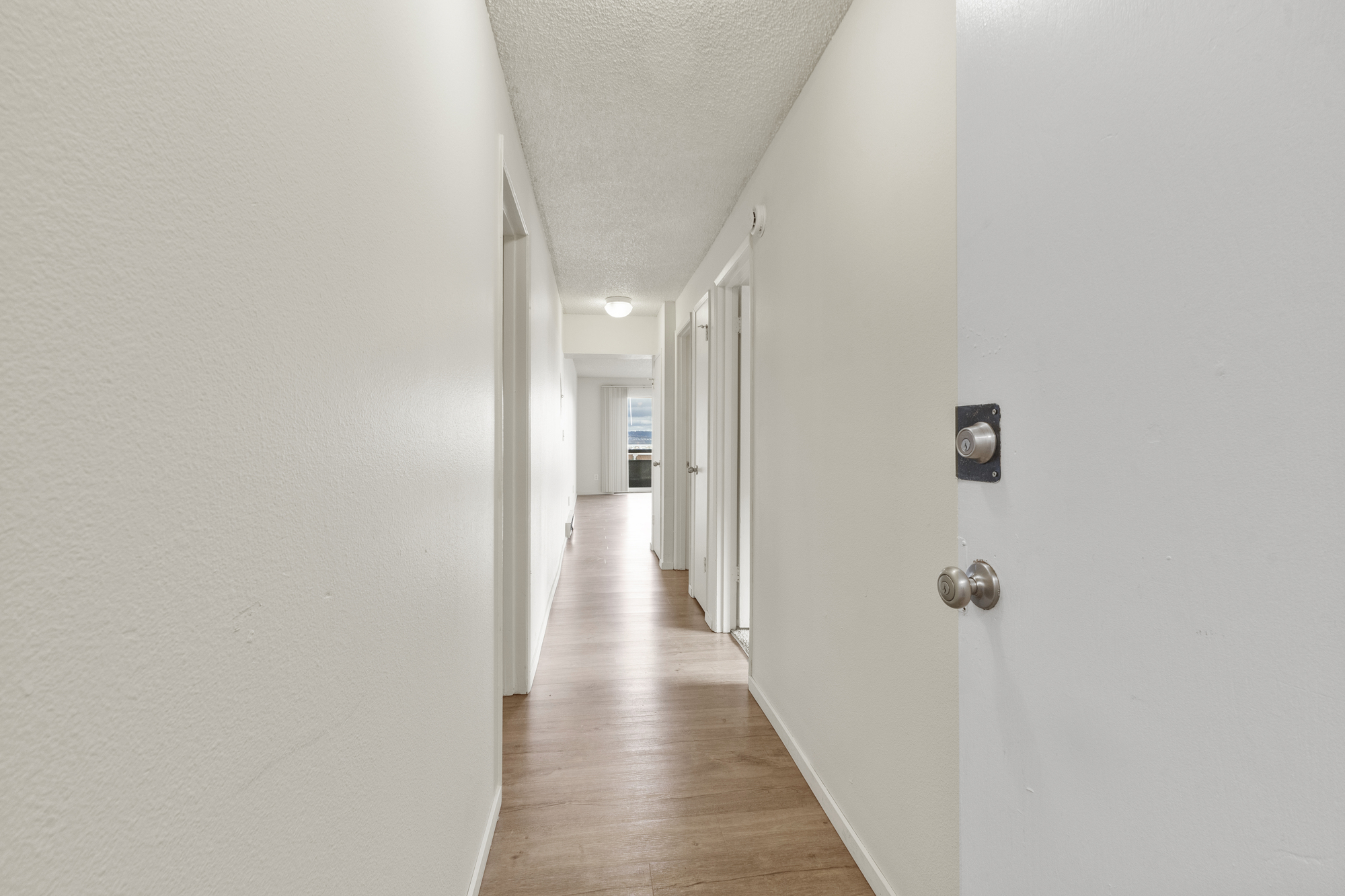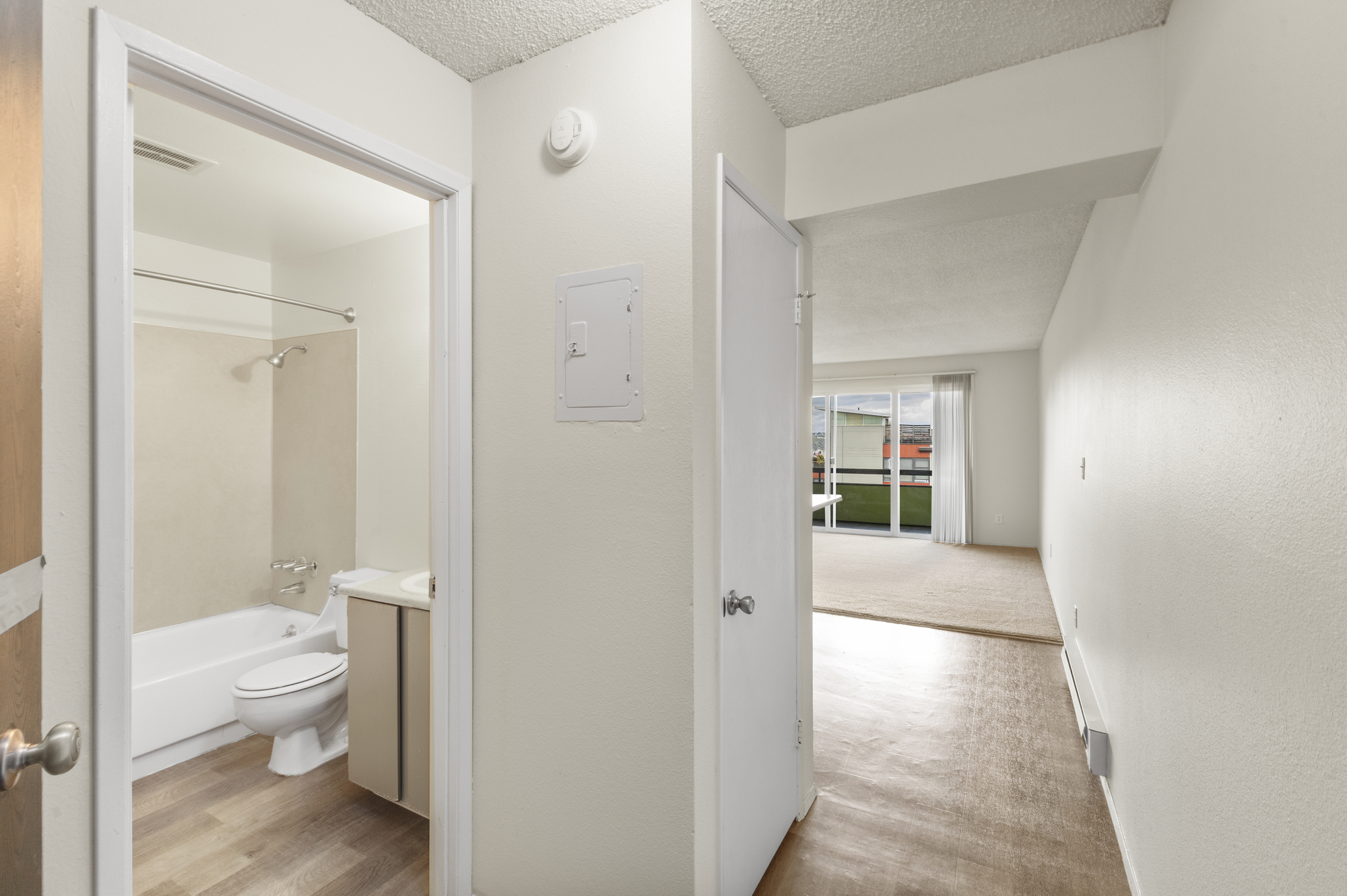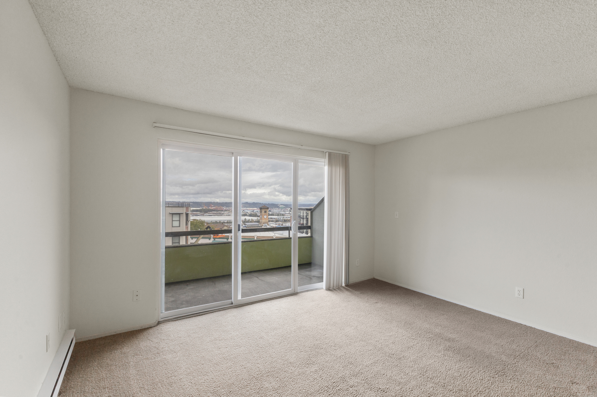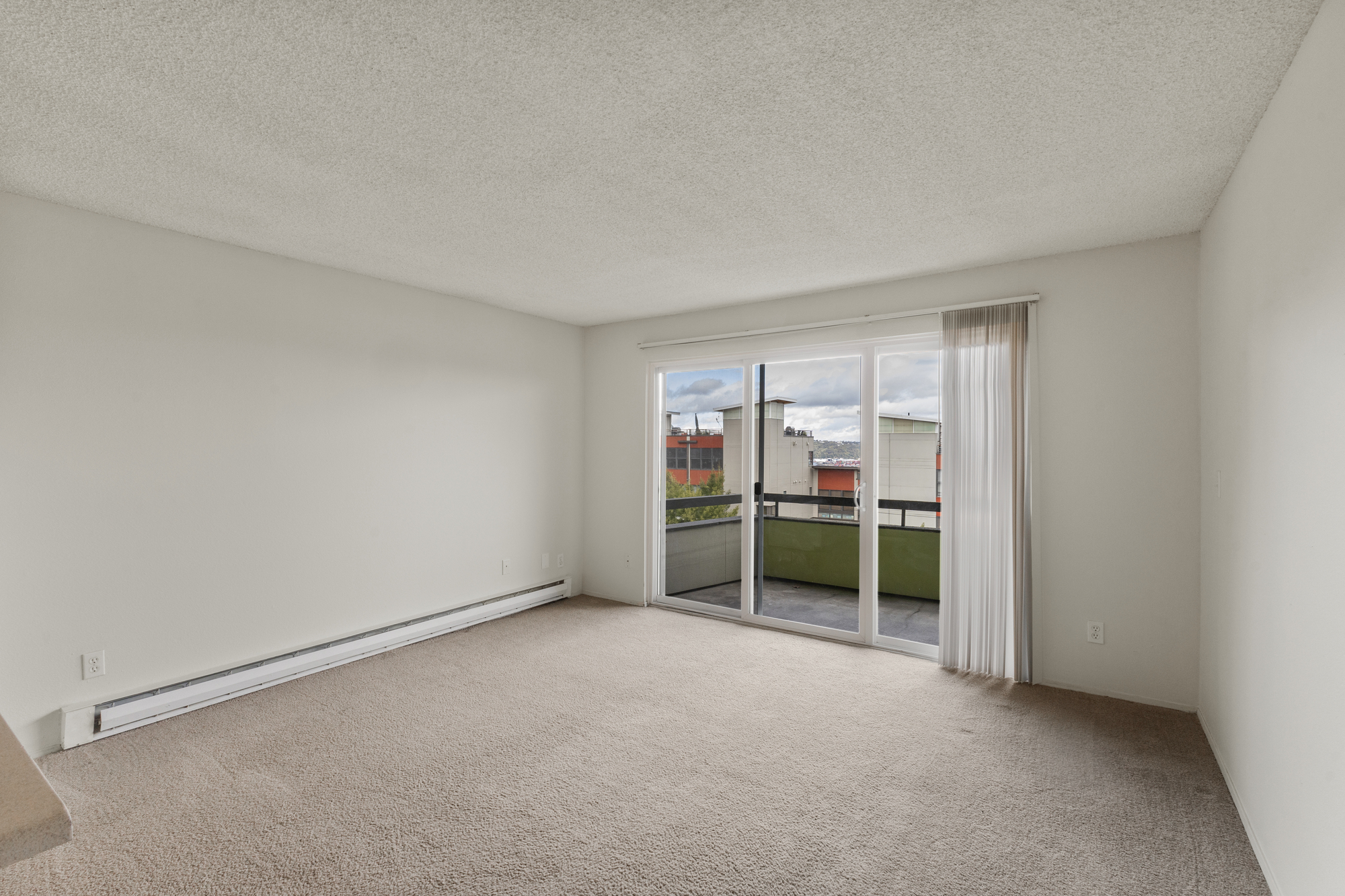 Each unit features thoughtful touches like breakfast bars, garbage disposals, and private balconies with views. Residents enjoy controlled building access, reserved and covered parking, and an onsite laundry center. Baycrest is also pet-friendly, making it a perfect choice for renters who value both home comforts and city living.